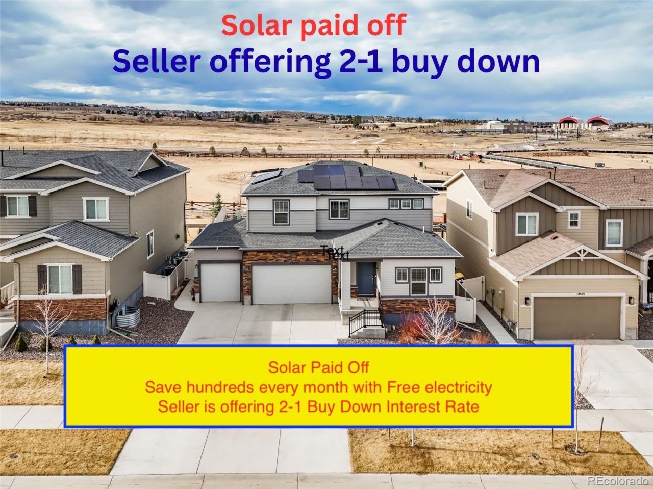 7000 will be credited to the buyers towards closing costs and /or rate buy down.Welcome to this stunning, contemporary two-story residence that perfectly blends stylish design with sustainable living. The exterior makes a striking first impression with its high-contrast color palette, featuring sleek gray siding complemented by warm natural stone accents and professional landscaping. A highlight of this home is the integrated solar panel system, offering significant energy savings and a reduced carbon footprint..Solar will be paid off at closing and that means FREE ELECTRICITY for LIFE.Modern multi-gabled roofline with a clean, low-maintenance aesthetic. An expansive concrete driveway leads to a generous three-car garage (one double-bay and one single-bay), providing ample room for vehicles, storage, or a workshop.The property features a drought-resistant rock landscape in the front and a manageable lawn, framed by young trees that offer future privacy.Step through the designer navy-blue front door into a bright foyer. The entry hall features beautiful, wide-plank wood flooring that flows throughout the main level. Double French doors open into a bright, versatile room?perfect for a home office, library, or formal sitting area. This space is flooded with natural light from a trio of windows.The home is finished in a neutral, modern gray palette with crisp white trim, recessed LED lighting, and high-quality fixtures throughout. The open-concept design ensures an airy feel, making the home ideal for both quiet family nights and hosting guests.This home is move-in ready and designed for the modern buyer who values both form and function.